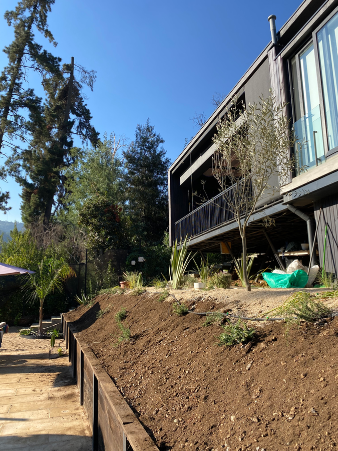 Diseño e instalación de jardín de estilo desertico. La clienta nos pidió un jardín minimalista que evocara su ciudad natal, La Serena. El resultado es un jardín con suculentas, cactus, olivos y romero rastrero con caminos sinuosos y tonos amarillos.