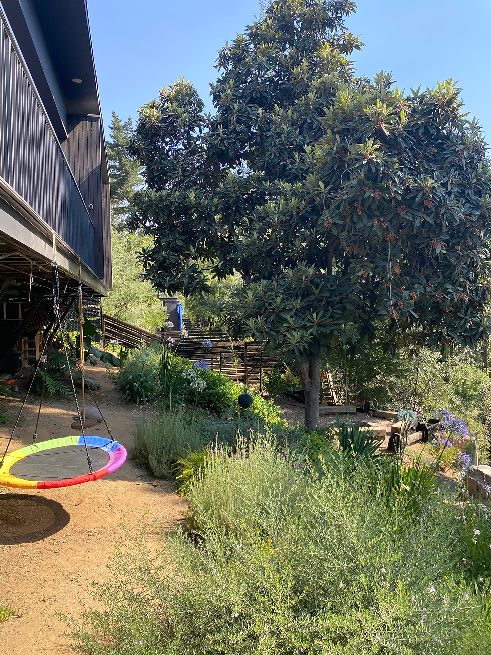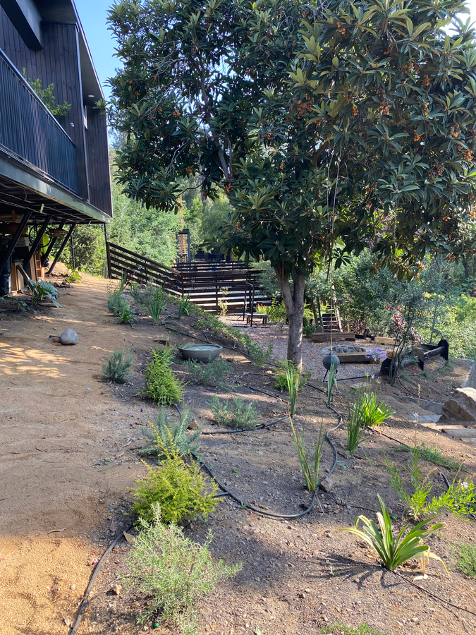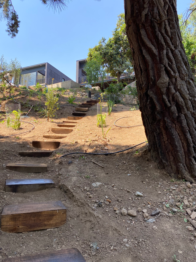 Proyecto de diseño de un jardín para una casa de un condominio nuevo en El Arrayan con mucha pendiente. Se diseñó un jardín que estuviera en armonía con el bosque y río vecinos, buscando usar especies adaptadas para el clima cordillerano y de bajo consumo de agua en los sectores con más alta radiación. Se incorporaron escaleras y senderos de durmientes para generar conversación entre los distintos sectores del jardin, junto con espacio de bancas para espacios para compartir.